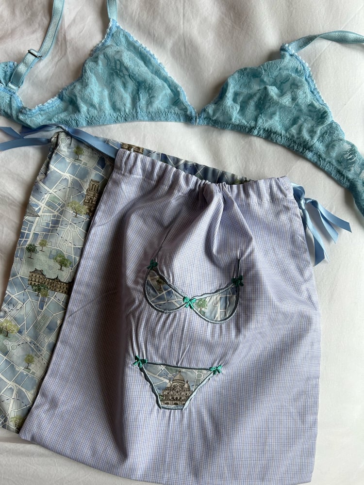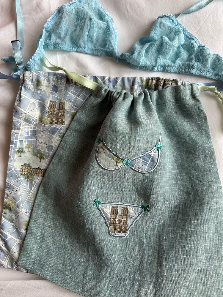 Duos de pochons de voyage ( environ 30 cms x 30 cms) , un en Liberty et l'autre en lin ou coton brodés d'un ensemble de lingerie en Liberty